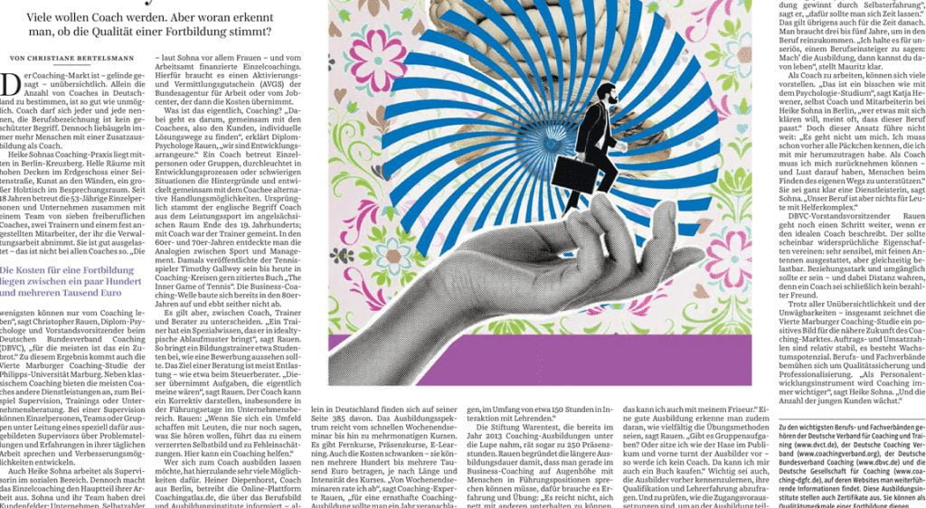 In der Süddeutschen Zeitung ist am 13. März 2020 ein Artikel über Coaching erschienen. Genauer gesagt zu der Fragestellung, was einen guten Coach ausmacht. Die Autorin, Frau Christiane Bertelsmann, interviewte dafür verschiedene Experten. Neben Christopher Rauen kommt hier auch Frau Sohna zu Wort. Lesen Sie selbst, was Coaching als Berufsbild und einen guten Coach charakterisiert.