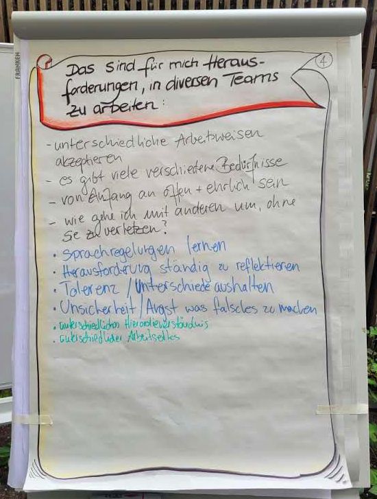 In unserem Workshop haben wir folgende Herausforderungen beim Arbeiten in diversen Teams zusammengetragen: